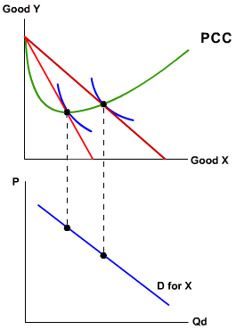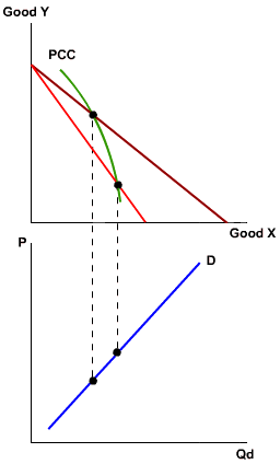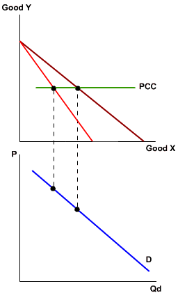 PCC 是看价格的改变,我们可以利用此来找出需求曲线。由于PCC只是单纯看价格的改变,价格改变会导致实质收入( Real Income )改变,但是名义收入( Nominal Income )是假定不变的。利用 PCC 找出来的需求曲线,是名义收入不变的需求曲线。