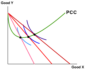 这里要补充一点,就是只有价格在变,其他东西是不变的,如收入。此外,亦只有一种物品的价格在变。若果两种价格也变,则有两条 PCC 。