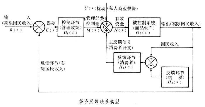 1985年,从国民经济实际统计数据出发,应用控制理论和系统工程方法,建立了国家宏观经济最优控制模型。这个模型是以1985~2000年的历年国民收入总和作为目标函数,以部门的基建投资和更新改造投资作为控制变量,进行了总体优化。模型包含3582个方程,其中1520个方程组成一个76维的状态方程,39维联立方程组成系统的输出方程,有760个控制变量,1660个约束方程,在大型计算机上进行总体优化设计。模型预测1985~2000年逐年国民经济增长速度和水平,分析了国民经济各部门的结构和重大比例关系的变化趋势、基本建设规模和投资方向、人民生活水平的提高和消费结构的变化等,为制订中、长期规划和政策分析提供了科学依据。下图是有关国民收入、经济管理政策、私人商业投资、商品生产、纳税和消费者开支等方面的经济反馈联系模型。借助这个反馈模型,经济系统的决策和分析人员就可以了解管理政策和私人商业投资对国民收入的全部影响。图中系统输出是实际国民收入c(s)=g2(s)n(s),式中n(s)为有效资金,可用n (s)=m(s)+u(s)+h(s)来计算。