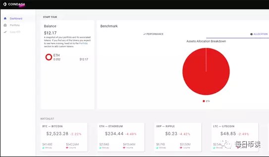 Coin大师目前已经有测试版发布,网址为https://app.coindash.io,进入后可以注册账号。之后输入你的以太坊地址,生成投资组合分析。也可以将自己的投资组合分享给其他用户。如果有人觉得你的投资组合很好,可以参照你的进行资产配置。目前测试版本已经完成了投资组合建立、分析、市场数据查看等功能,具有较高的项目成熟度。