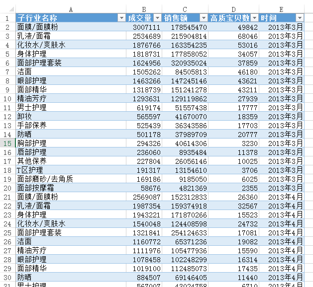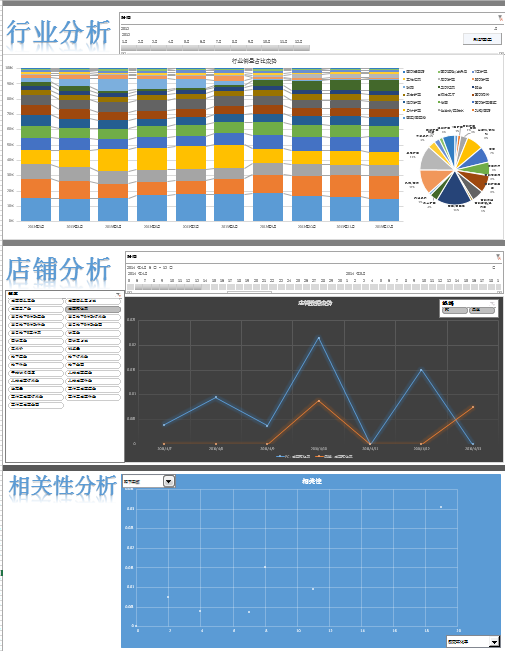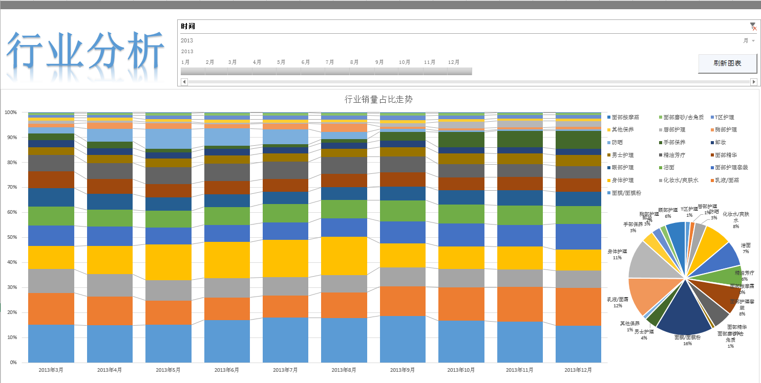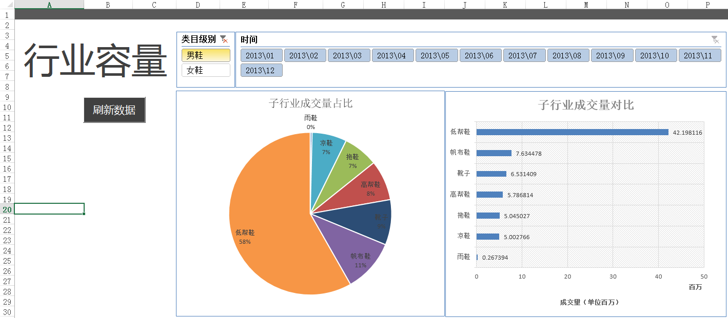 把行业数据(子行业和属性)展示出来,配合饼图、折线图(参考初阶第一篇)和堆积条形图可以做出漂亮的分析模型。下面教大家做个按键,来实现半自动刷新。