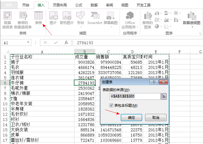 这里是我提前抓取的数据。把数据全部选中,点击插入表格后,数据表格周围会出现流动的蚂蚁线,会有一个创建表的对话框弹出,我们直接点确定就OK了。