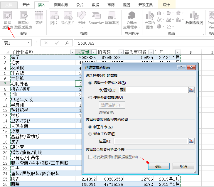 然后我们再点击插入数据透视表,一样也会出现流动的蚂蚁线,我们点确定就OK。