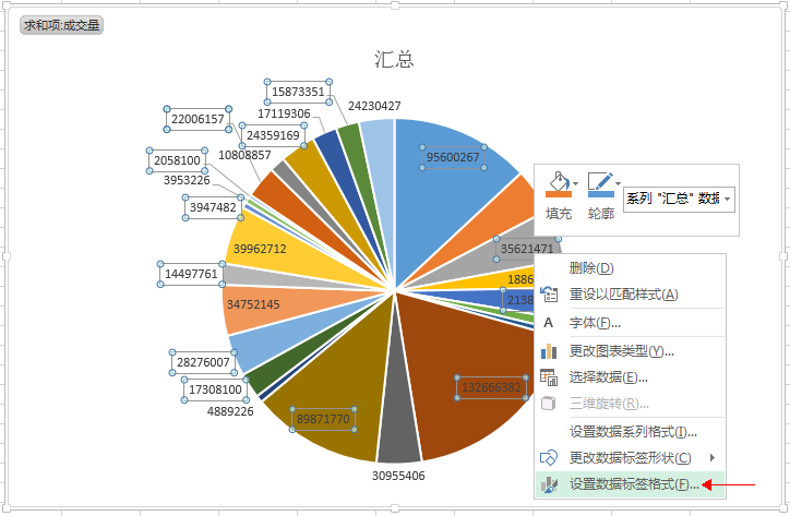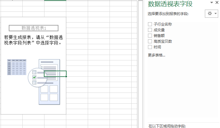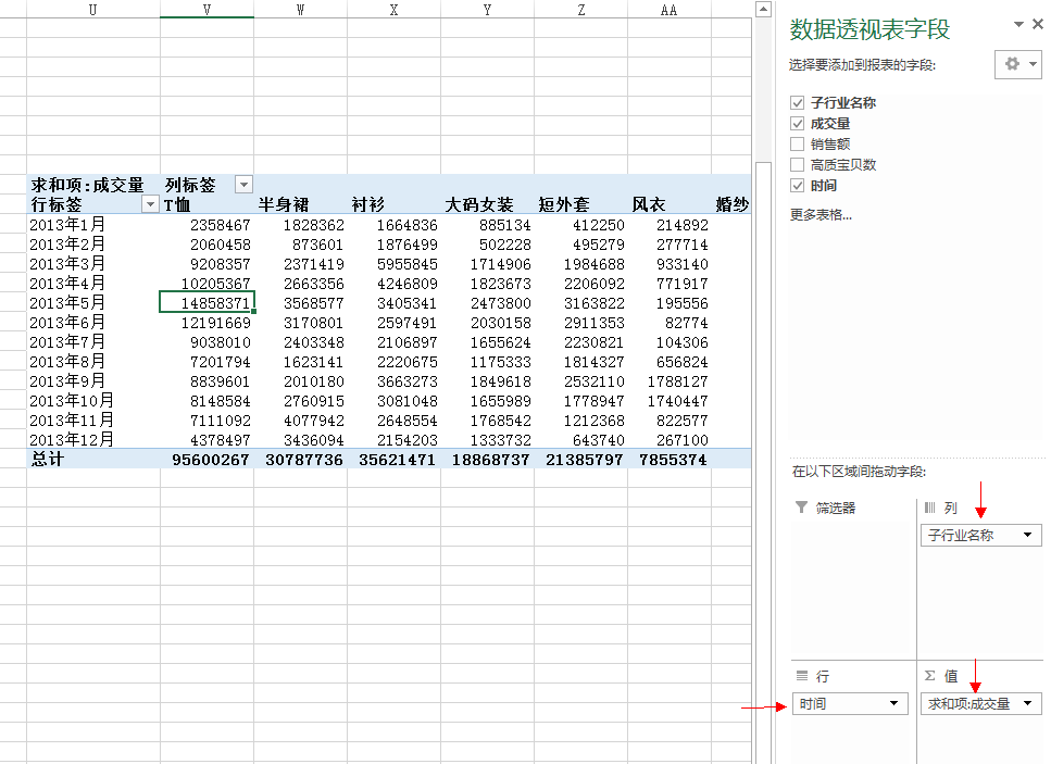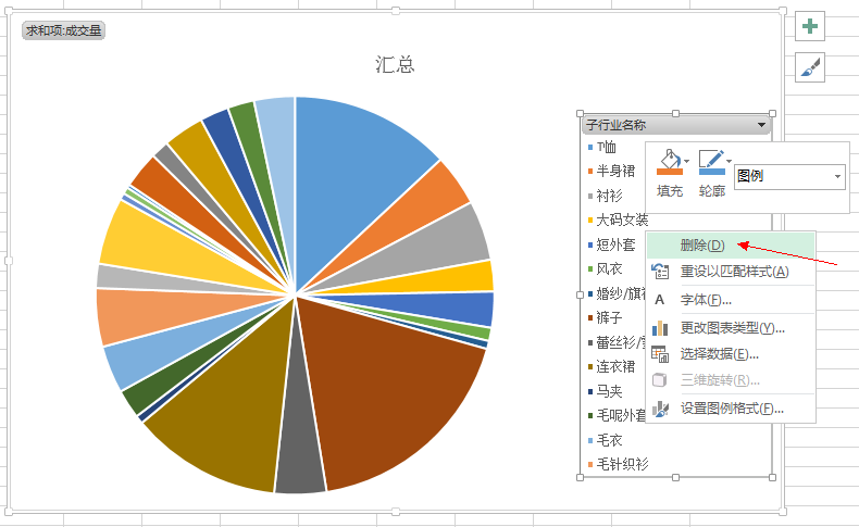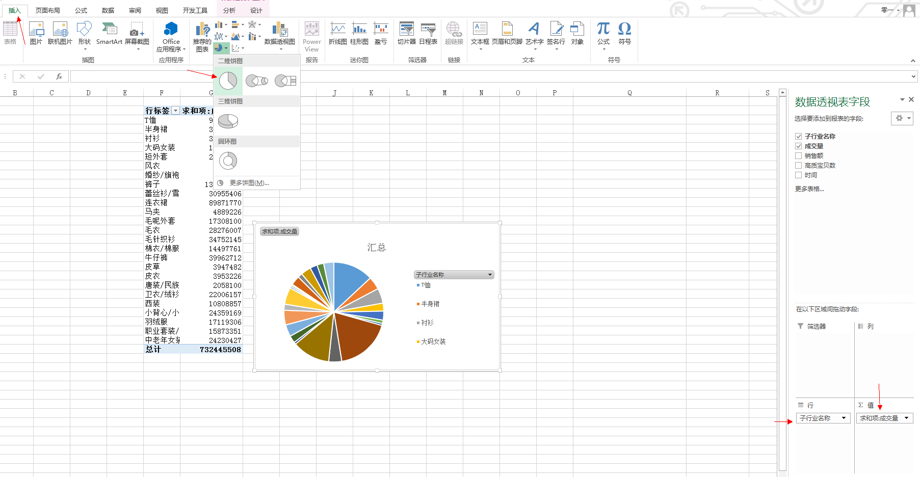 到了这一个界面,我们再把子行业成交量拖到行标签,成交量拖到数值。再选中插入饼图,会成为下面的一个样式。
