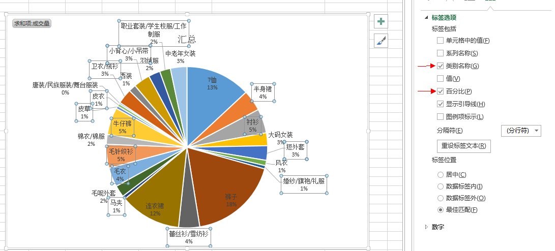 接着把右边的图例给删除,右击添加数据标签,选中设置数据标签格式,会出现一个图例选项,我们选中类别名称跟百分比。之后,我们这个饼图就做好了,做好后,我们可以将它进行调整到美观跟清晰大小。另外加上图表的配色这些都是可以自定义的哦。图标的名称更改都是可以自行进行设置。