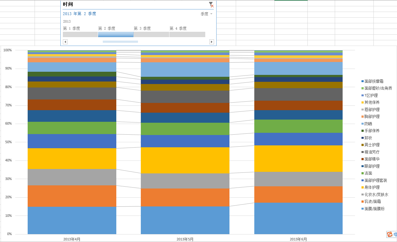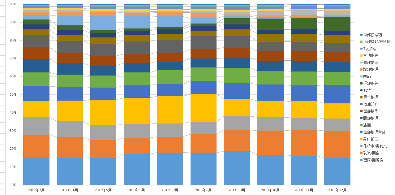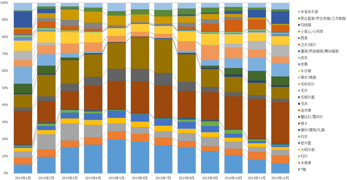 这张图就是堆积条形图,每个月都是100%,反映每个月下,各个分类的占比情况,色块越大代表占比越大。可以清晰看出某个子行业全年的占比走势。