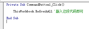 敲入ThisWorkbook.RefreshAll这段代码,然后关闭工程编辑器,并退出设计模式(在设计模式下,命令按键是不起作用的。