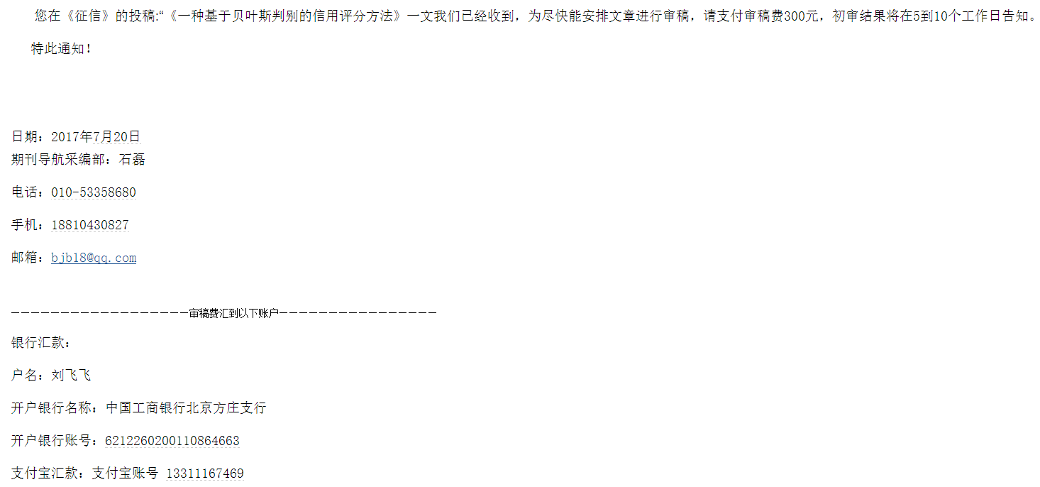 网上查询过《征信》期刊是不收审稿费的,但是本人在征信投了一篇论文,收到一个要收审稿费的邮件,曝光一下,看是不是骗子: