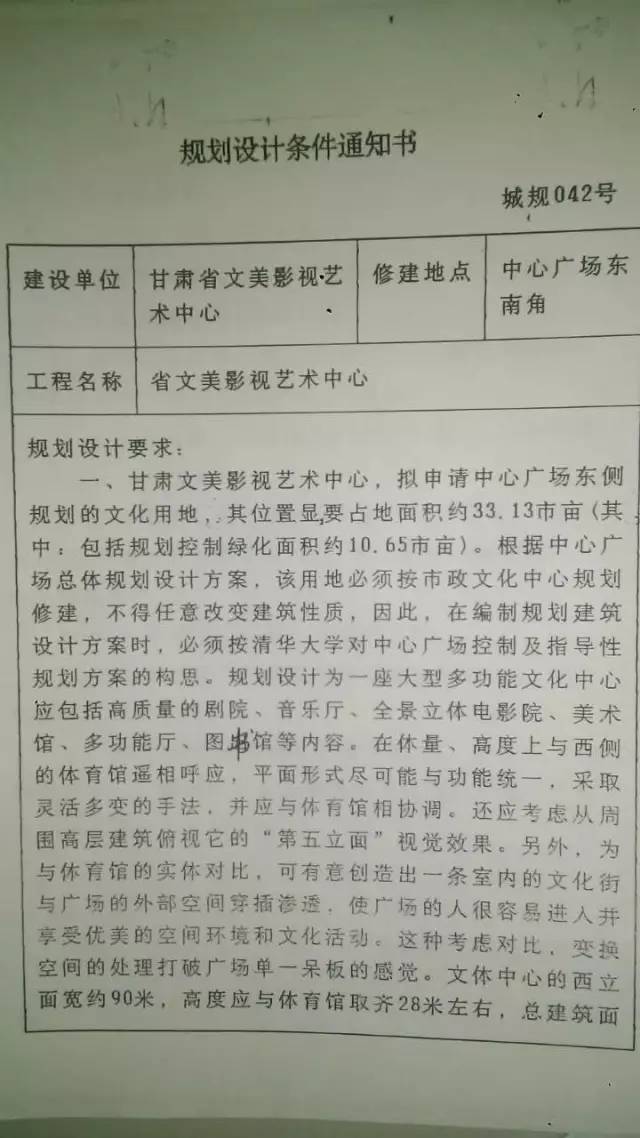 1994年8月3日,兰州市城乡规划土地管理局向“建设单位”省艺术中心发出”城规042号”《规划设计条件通知书》。