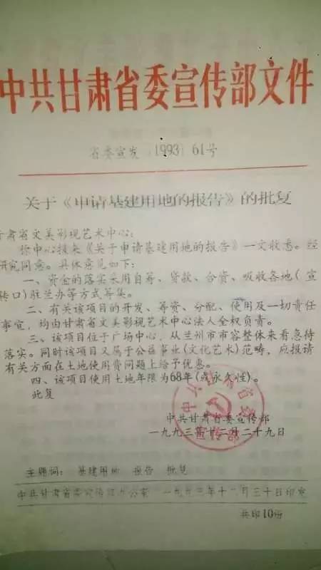 毫无疑问,这里是兰州唯一的黄金之黄金地段。这块地最早规划为甘肃博览馆,1976年动议过毛主席纪念堂,1978年考虑为甘肃彩电中心。1993年,我创办的甘肃省文美影视中心在甘肃大地迅速崛起。经过协商,同年6月,兰州市城乡规划土地管理局致函我中心:该地段“已经规划为文化艺术中心。你中心若计划开发建设此项目,请按规划审批和用地的程序办理(附兰州市中心广场规划和总平面图)。”