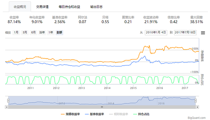 从测试结果来看,该事件驱动策略为长期正收益系统。因为财报公布事件会有一个期限规定(年度报告是每年结束后4个月内,半年度是上半年结束后2个月内,季度报告是季度结束后1个月内),所以某些时间段不会有公司公布财务报表,当然那段时间就不会出现业绩快报净利润大幅增长的事件,因此仓位很多时候并不是100%。