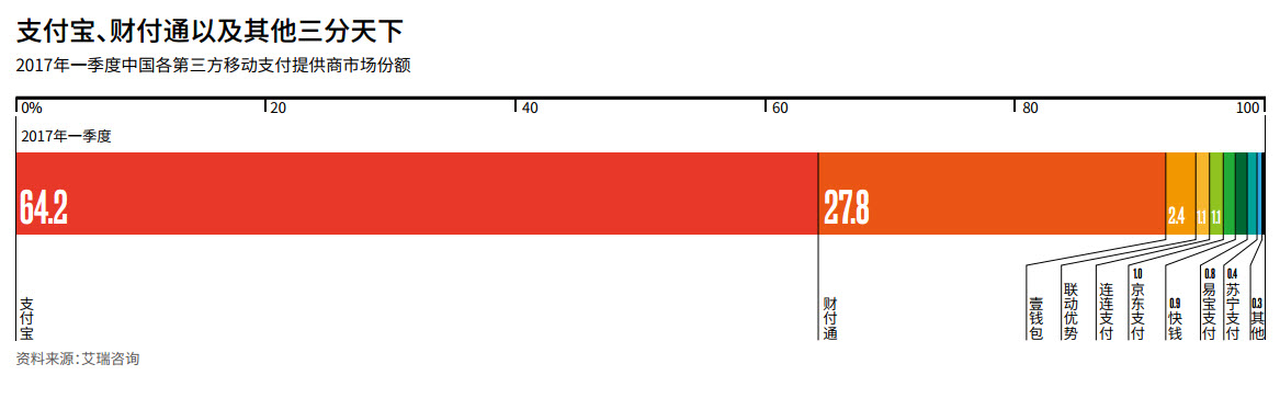 6月30日,咨询公司艾瑞(iResearch)公布的数据显示,2017年一季度中国第三方移动支付交易市场规模达到22.7万亿元,同比增长113.4%。其中,支付宝和财付通合计占据中国国内移动支付市场94%的份额,京东支付排名第六。