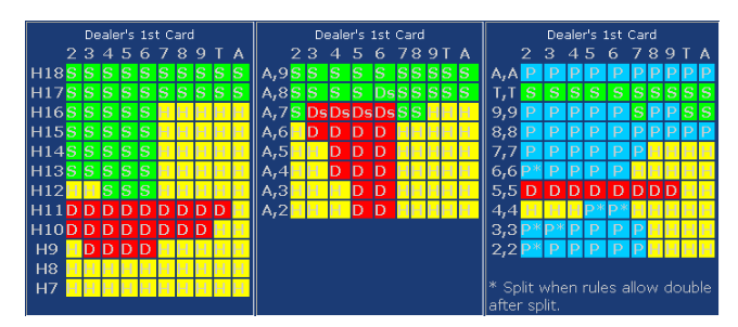 回到“不做高频,量化交易获利的概率能不能战胜抛钢蹦”这个问题上来。21点的最佳策略胜率为49%左右,是数学家通过大量的模拟计算得到的结果,玩家只用记住下列三个矩阵里的内容即可应对庄家不同的出牌情况: