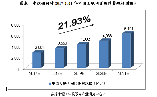 综合以上因素,中投顾问发布的《2017-2021年中国互联网保险产业深度调研及投资前景预测报告》预计,2017年我国互联网保险保费规模将达到2,801亿元,未来五年(2017-2021)年均复合增长率约为21.93%,2021年保费规模将达到6,191亿元。