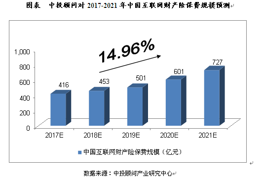 综合以上因素,中投顾问发布的《2017-2021年中国互联网保险产业深度调研及投资前景预测报告》预计,2017年我国互联网财产险保费规模将达到416亿元,未来五年(2017-2021)年均复合增长率约为14.96%,2021年保费规模将达到727亿元。