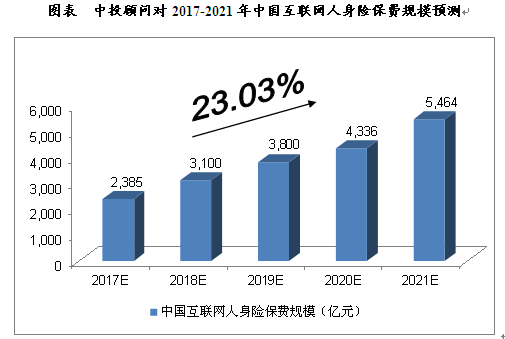 综合以上因素,中投顾问发布的《2017-2021年中国互联网保险产业深度调研及投资前景预测报告》预计,2017年我国互联网人身险保费规模将达到2,385亿元,未来五年(2017-2021)年均复合增长率约为23.03%,2021年保费规模将达到5,464亿元。