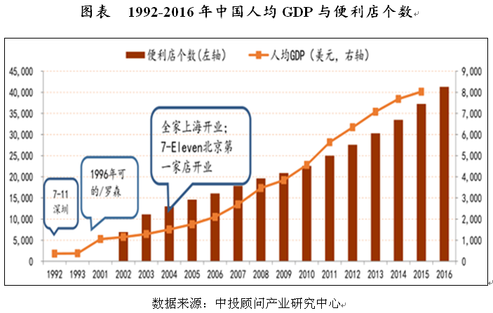 1992年,7-Eleven引入深圳。1996年我国人均GDP为709美元,农工商超市(集团)有限公司旗下的全资子公司上海可的便利店于1996年在上海开业。同年,由日本上市企业罗森株式会社同上海华联(集团)有限公司合资设立上海华联罗森有限公司,在上海市长宁区的古北新区开设第一家便利连锁店。2004年我国人均GDP达到1509美元时,全家进驻上海、7-Eleven进驻北京。