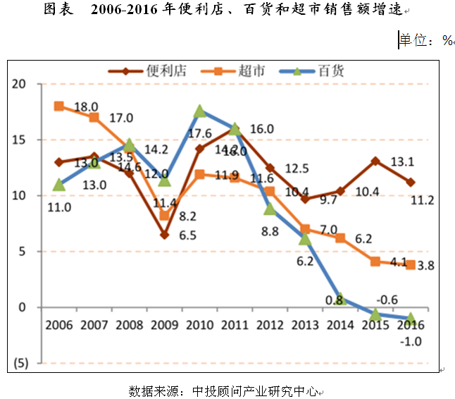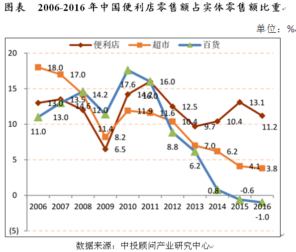 便利店增速高于行业。根据数据显示,中国便利店销售额占实体零售额的比重2013年起加速上升,2016年便利店份额为0.65%。并且便利店销售额增速从2010年起一直保持两位数,2011年起超越百货 和超市增速。百货和超市销售额增速从2011年起快速下降,百货在2015、2016年增速为负。