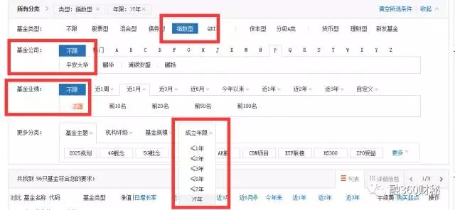 基金公司“不限”,基金业绩“不限”,更多分类中的“成立年限”选择“≥7”。