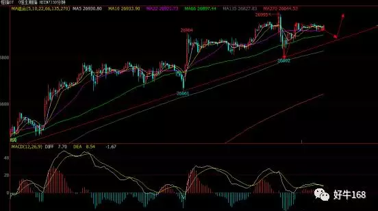从三十分钟图来看,恒指昨日形成的最大回撤至26800一线,而价格得到了135日均线的支撑,随后进一步反弹,在26900之上震荡,价格采取用震荡去消化掉空头的力量,那么今日的回撤力度就应该在26870附近了,连接26661与26802可得。个人建议,空单可在26990附近进场,止损27010,止盈26890;26870附近布局多单,止损26850,止盈26960。