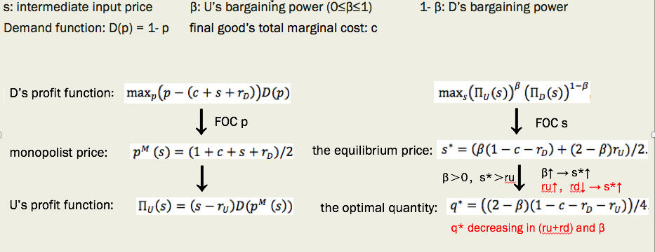 模型基本是:专利持有者H,上游生产商U,下游生产商D,H向U和D授权,收取ru rd的royalty rate,U生产中间产品,以s价格卖给D,D以P出售最终产品。