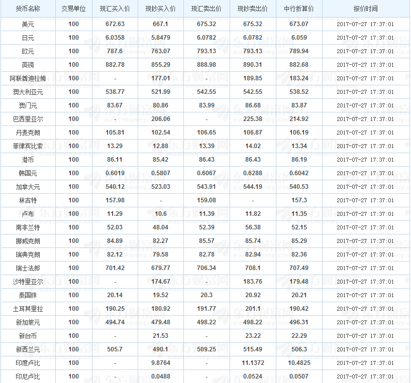 中国银行外汇牌价 2017-07-27(图片来源:东方财富网)