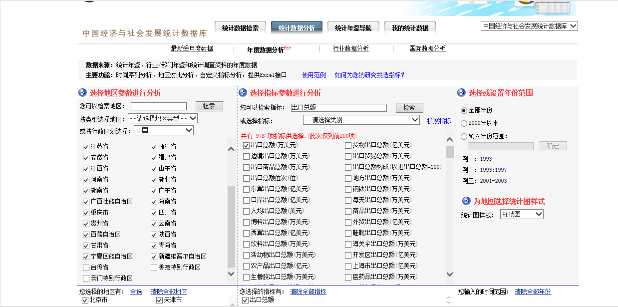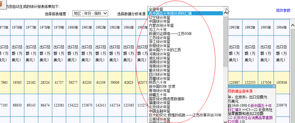 还有一点缺陷就是,这个数据库能搜到的某一年鉴中的数据,可能不全,就是说,你在表格中选定了某一来源的数据,比如说来源于中国统计年鉴的进出口数据,可能只能显示到1998年,但是你自己实际去下载原数据后会发现,1999~2015年的数据也是可得的,这又会给数据搜集的工作造成困扰。