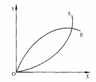 若此时国际市场上的价格比率 ( 贸易条件 ) 比国内更有利,用 Tl 表示,则生产移到P1 点,消费移到较高的无差异曲线 I上的 E 点,其中 S , E ,的 Y 商品进口是以输出数量为 S ,P1 的 X 商品交换得来的。若此时该国面临更有利的价格比率( 贸易条件 ) ,用 T2 线表示,则 x 商品的输出量将增加到 S2P2 ,而 Y 商品的进口量上升为S2P2 。有了这些数据,我们就可以推出提供曲线,如图. 2-10 中左边部分,先画出各贸易条件线 T0 、 T1 、 T2 ,其斜率与右边象限内的贸易条件线相对应。把出口标在横轴上,得出点Xl 和 X2 ,它们与原点的距离分别为S1P1 和 S2 P2 ;纵轴上的点Y1 和 Y2 则表示进口,其与原点的距离分别为 S1 E1 和 S2 E2 。连接进出口的组合点,得到在各个国际价格比率下贸易均衡点的轨迹 OA ,便是该国的提供曲线,以纵轴为中心轴,转动坐标平面,将第二象限转到第一象限的位置上,得到如下图所示的该国的提供曲线 OA ,我们假定这一国家是甲国。