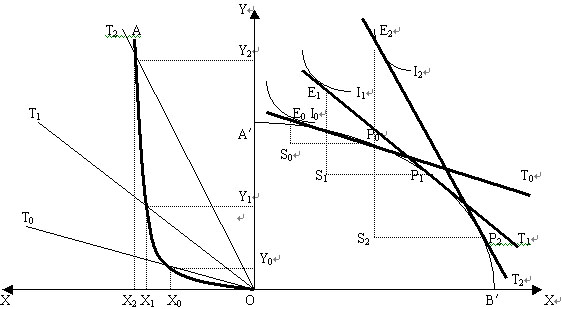 如下是提供曲线推导图,该图右边是一国贸易前的情况:在 T0 线表示的国内贸易条件下, x 和 Y 的生产与消费在 E0 点处于均衡位置。