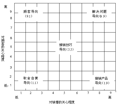 从以上分析可以看出,在网格图上X轴是显示对销售工作的关心程度,Y轴显示的是对顾客的关心程度,在两个轴线上所反映的是营销过程中的两类极端情况,一种是完全硬性的传统销售方式,毫无顾客满意度的成分在里面,另一种则完全是一种与顾客建立了人与人之间的感情基础,这一基础还只是销售行为与业绩提升的必要条件。