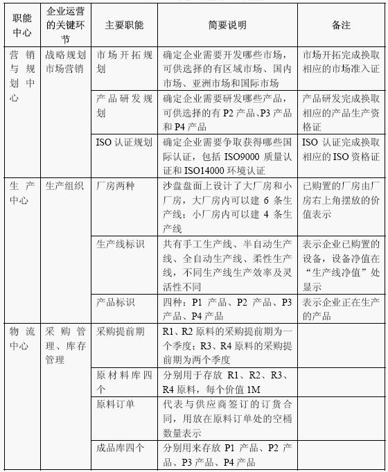 沙盘盘面按照制造企业的职能部门划分了四个职能中心,分别是营销与规划中心、生产中心、物流中心和财务中心。各职能中心覆盖了企业运营的所有关键环节:战略规划、市场营销、生产组织、采购管理、库存管理、财务管理等,是一个制造企业的缩影。