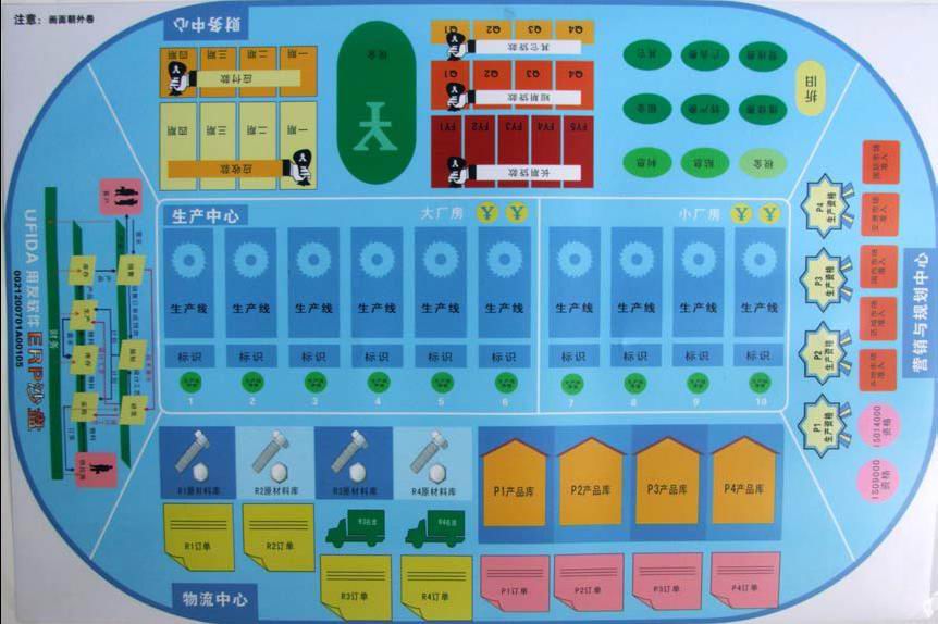 ERP沙盘模拟教学以一套沙盘教具为载体。沙盘教具主要包括:沙盘盘面六张,代表六个相互竞争的模拟企业。下图就是沙盘盘面全图。