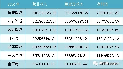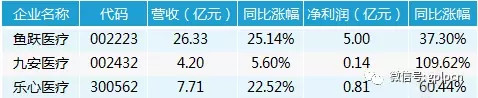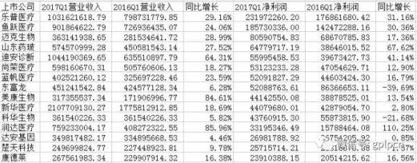 下图是净利润排行前15的上市企业2017年一季度的报表,可以看出营业收入同比都是增长的,净利润有13家企业是同比增长的,特别是乐普医疗和鱼跃医疗,一个医用设备巨头,一个家用设备巨头,净利润同比增长都达到了30%。