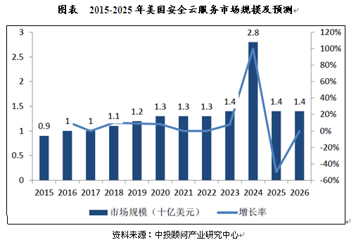 中投顾问《2017-2021年网络安全产业投资分析及前景预测报告》中数据指出,美国2015年云安全服务市场规模为9.25亿美金,预计以4.55%的复合年增长率增长,预计在2025年达到14亿美金。同时,美国2015年IT支出约5100亿美元,安全云服务与IT支出比值约为2‰。