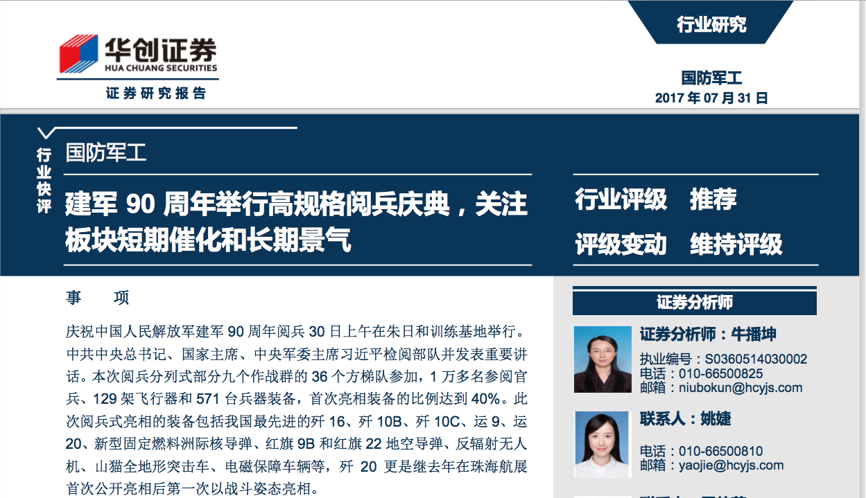 20170731-华创证券-国防军工:建军90周年举行高规格阅兵庆典,关注板块短期催化和长期景气.pdf 大小:(825.39 KB) 只需: 3 个论坛币 马上下载