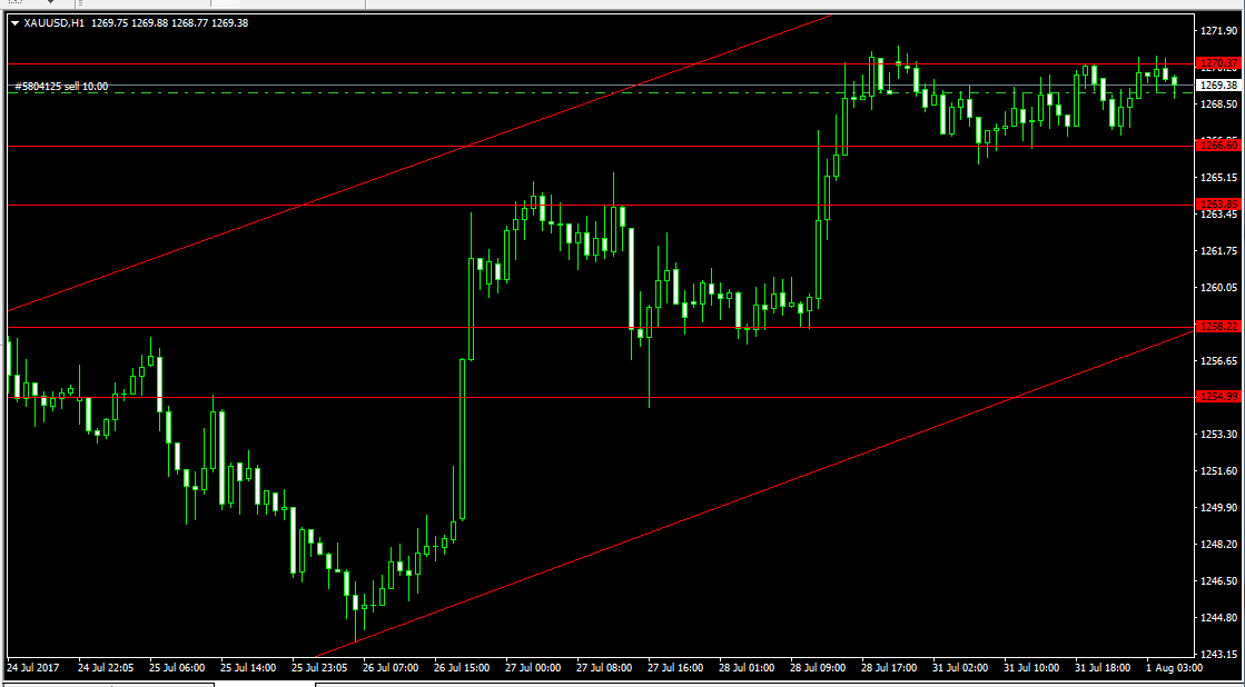 黄金整个7月份都是延续上涨态势,中下旬更是没有走势资历所画出的上行通道。那么接下来8月份黄金又将何去何从呢?从图中可以看出,行情依然会持续走高,止于目前1270一线的压力,在1266到1270这个区间来回震荡调整,那么这个调整于对多头是好事还是我们常说的横久必跌呢!其实资历认为并不重要,重要的是我们操作中应该认清上行大趋势,上轨目前依然相差很远,那说明大的方向没有变,短期有所回调那是正常的,有回调才有更大的动力上涨!那么操作上我们又该如何的去把握呢?没有思路的朋友可以参照下资历黄金1小时图的走势图,目前1266到1270区间来回操作,突破或者跌破就顺势操作,下方支撑以及上方压力都比较明显,祝各位朋友8月大获全胜!