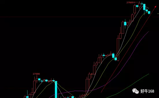 从小时图来看,价格昨日延续大涨走势,目前在高点依旧没有看到明显的拐头信号,价格昨日夜盘应该依旧回调结束或者临近结束了,早盘价格就有见底冲高的可能。建议尽量回踩做多为主,如果低开低走触及27500附近可以做多,止损27480附近,止盈27600附近,同时如果跌势较猛就等价格跌完返回27500再做。同时如果今日价格先行上探高点,需要看高开幅度以及回落速度,如果价格高开高走破高,后迅速回落可以考虑带止损小追空单,同时如果今日只是小高开,同时上涨比较稳定可以直接追多。