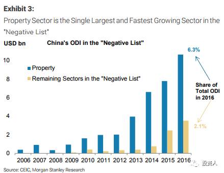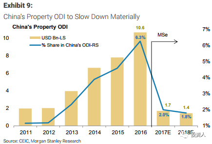 在海外地产投资受到中国ZF严密监管的情况下,摩根士丹利分析团队预计,2017年中国的海外地产投资将从2016年的106亿美元锐减到17亿美元,同比下降84%。而在2018年,这个数字将进一步下降至14亿。