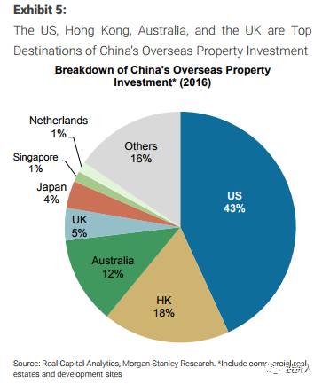 Real Capital分析公司数据显示,2016年中国海外商业地产投资的主要去向是美国(43%)、香港(18%)澳大利亚(12%)和英国(5%)。其中,由于在过去六个月内监管力度加剧,中国对英国的商业地产投资中有34%处于停滞待审状态,对美国的商业地产投资中则有7%处于停滞待审状态。