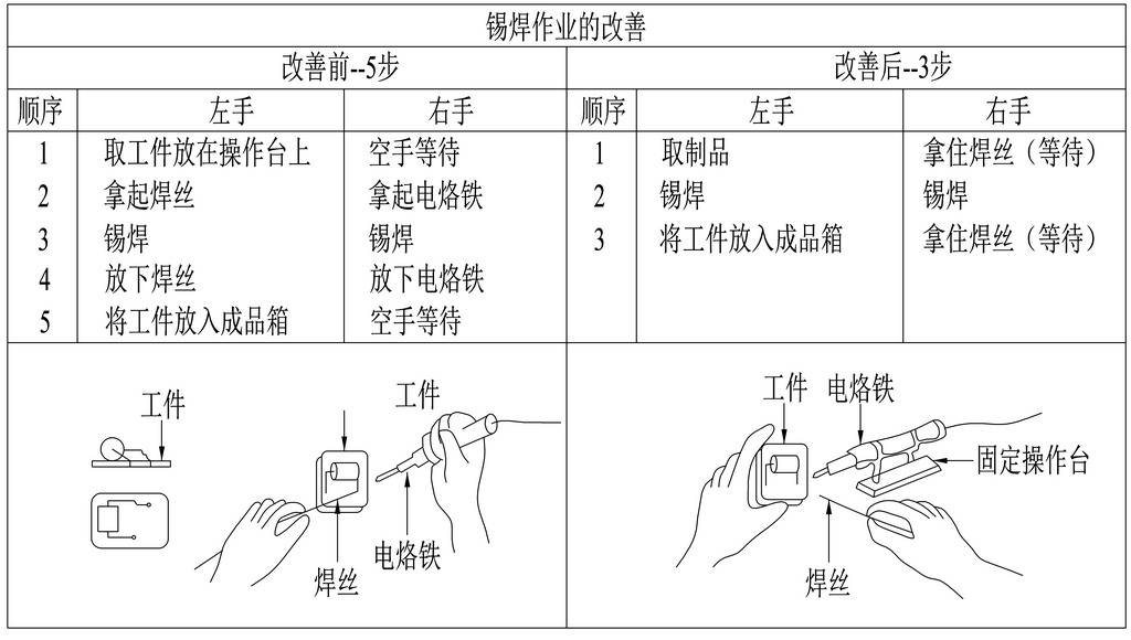 在锡焊的作业中,改善之前需要5步骤,改善之后只需要三步骤,锡焊作业时间大大减少,产出数量显著增加。在改善之前,需要做的步骤是:1.左手取工件放在操作台上,右手空手等待;2.左手拿起焊丝,右手拿起电烙铁;3.左手锡焊,右手锡焊;4.左手放下焊丝,右手放下电烙铁;5.左手将工件放入成品箱,右手空手等待。从动作过程中可以看到左手有2步骤在空手等待,没有达到“两手应尽量同时使用”的原则,可以通过重排的方法合理分配两手的动作,将“拿起焊丝”的工作分配给右手;“取工件放在操作台上”、“空手等待”和“拿起电烙铁”的步骤可以按照“动作单元要尽量减少”的原则进行取消;“拿起电烙铁”的步骤按照“动作单元要尽量减少”的原则进行取消和简化,使用固定操作台来固定电烙铁(如图6-49所示)。