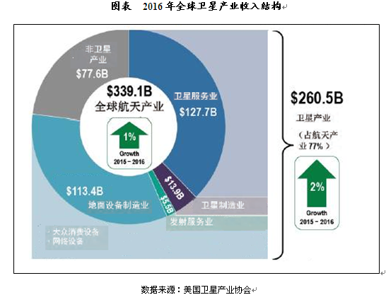 2016年全球卫星产业总收入达到2605亿美元,同比增长2%;其中卫星制造行业收入139亿美元,卫星服务1277亿美元,地面设备制造收入1134亿美元。其中卫星服务收入中,商业消费类收入为1047亿美元,为整体收入的82%。