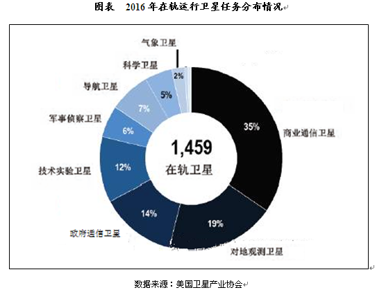 中投顾问发布的《2017-2021年中国卫星产业深度分析及发展规划咨询建议报告》指出截止2016年12月31日,全球共有在轨卫星1459颗,分属59个国家,美国拥有594颗。所有在轨卫星里,数量最多的是商业通信卫星和遥感卫星,分别占35%和19%。过去的5年,卫星数量增长47%(2012年是994颗),发射量增加53%,平均每年144颗,多数是小于1200公斤的小微卫星。卫星(特别是通信卫星)的平均寿命达到15年,在轨卫星中有247颗是2002年之前发射的。静止轨道卫星数量520颗(多数是通信卫星)。