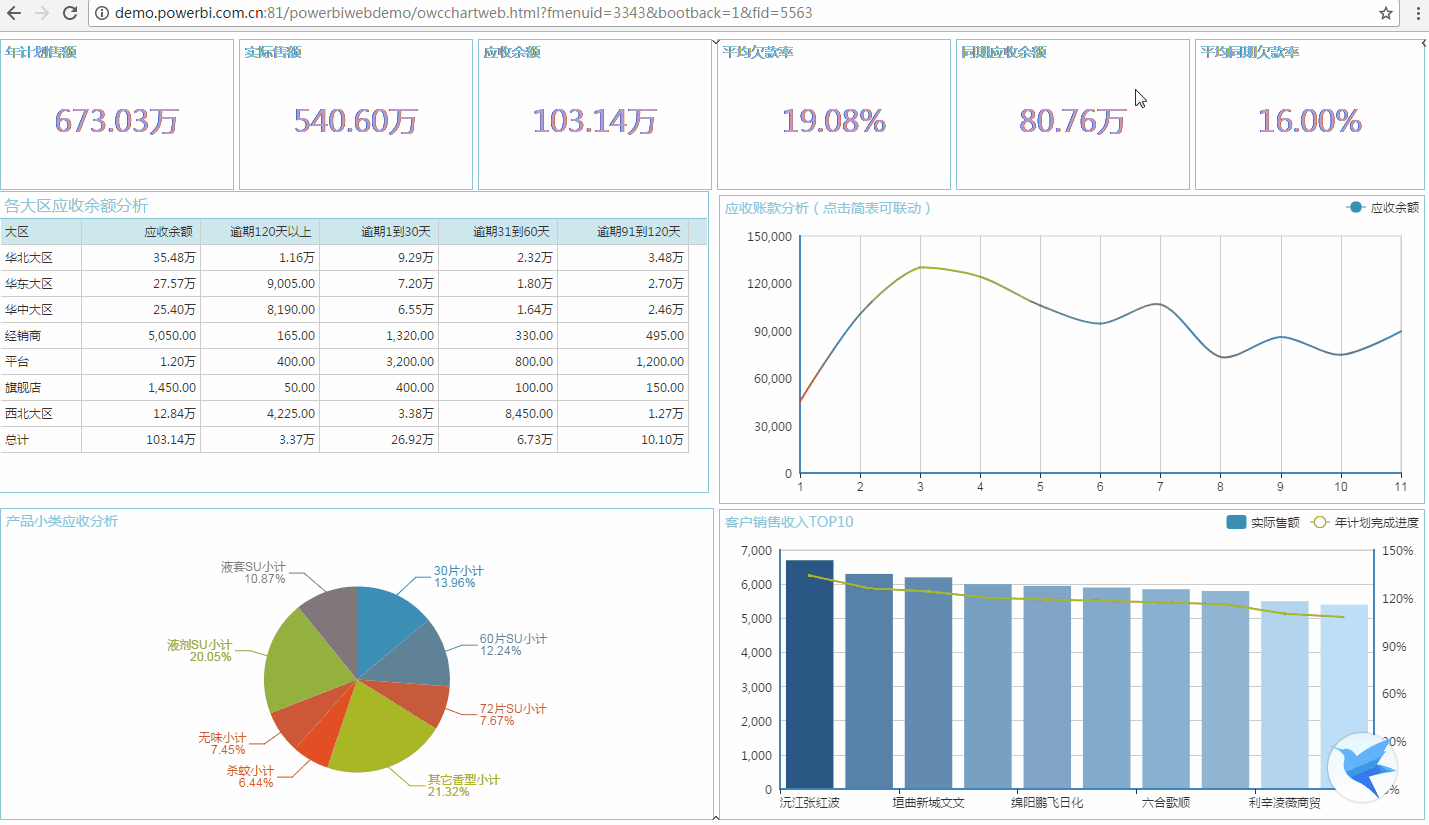 BI解决方案——应收综合分析的报表对快消行业中的实际销额、应收余额、逾期等进行了分析。通过数字图展示了年计划销额、应收余额等六个指标,简表对各大区的应收余额和逾期情况进行了分析,饼图展示了应收余额的产品小类占比,折线图展示了应收余额的趋势情况,柱形图展示了客户的实际销额和完成进度的TOP10进行了分析。