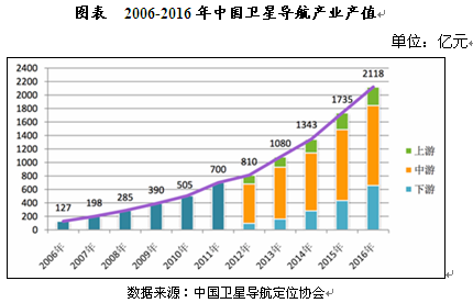 中投顾问发布的《2017-2021年中国卫星产业深度分析及发展规划咨询建议报告》指出2016年我国卫星导航与位置服务产业总体产值已突破2000亿元大关,达到2118亿元,较2015年增长22.06%。其中,包括与卫星导航技术直接相关的芯片、器件、算法、软件、导航数据、终端设备等在内的产业核心产值达到808亿元,北斗对产业核心产值的贡献率已达到70%,国内行业市场和特殊市场中,北斗兼容应用已经成为主流方案,大众市场正在向北斗标配化发展。