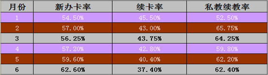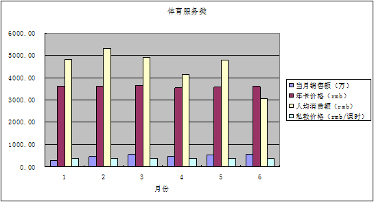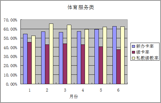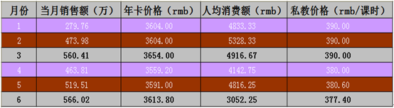 从上图表可以得知,同样为按次消费的健身产品,健身年卡价格随季节有一定波动,总体平均为3500-4000rmb;私教价格的时间周期性则比较稳定,1课时均在350-400元。大众对健身消费的承受能力并不高,平价化的健身产品仍有较大市场。当人均消费额降低时,全月销售额有所上升。可见健身产品的销售价格策略在目前仍是有效的方法之一,而目前杭州市体育服务产品(健身房)的价格略显偏高。