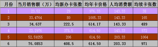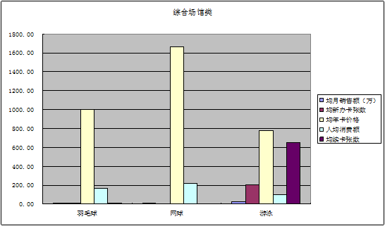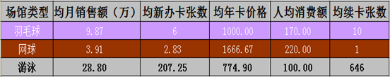 综合类场馆新办年卡数量随时间变化趋势较明显。天气转暖后,整体办卡情况有巨大好转。综合场馆属于较为平价的消费。年卡价格在1000元左右。按场馆类别来分别统计可以得知年卡价格最高的网球馆销量最差,羽毛球馆和游泳馆年卡价格相差不大,游泳馆办卡张数为羽毛球馆数倍。从上述表格可以清晰呈现出,杭州市城市居民对于游泳运动健身的偏好。