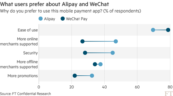 More users said they preferred WeChat Pay for ease of use (see chart) — this is a 900m strong peer-to-peer network in which users can transfer amounts as small as Rmb1. In January 2014, WeChat pioneered the digital red envelope, transforming the traditional lunar new year cash gift into a marketing phenomenon and turning China’s most popular messaging app into a direct Alipay competitor. Since then, WeChat Pay’s growth has been fuelled by transactions between individuals, and with online and offline vendors.