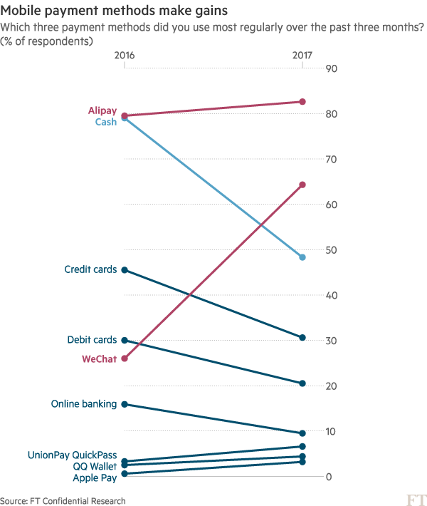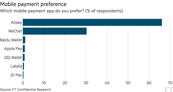 Other forms of payment were also-rans; UnionPay QuickPass, owned by the state-run card payment system, was chosen by just 6.6 per cent. Apple Pay’s popularity may have surged in China during the past year but it was still chosen by just 3.2 per cent of respondents (Apple is now intensifying its marketing push in China in co-operation with UnionPay).