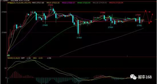 从三十分钟图来看,恒指在27600至27500之间盘整,日线当中价格触及五日均线附近,且MACD指标动能绿柱进一步放量,价格有进一步回落需求,需注意向下跌破震荡区间,早间建议以区间震荡的方式去操作,空单可在27600附近进场,止损27650,止盈27500;27500附近布局多单,止损27400,止盈27600。
