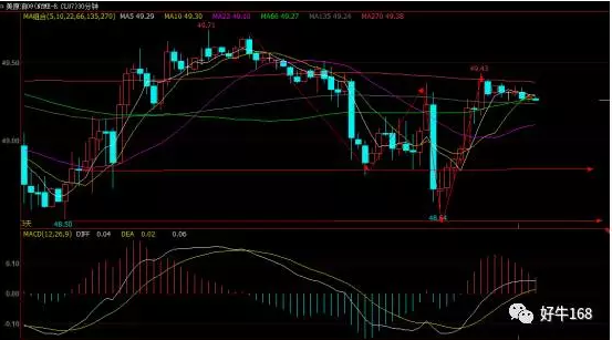 从三十分钟图来看,昨日原油回落至48.80附近得到了支撑,随后价格再度下压到48.5附近,并未去突破此支撑点位,所以日线级别当中依旧属于在盘整走势当中,而从日线当中在135日(50美元)、270日(50.40美元)都存在压力,且上方135日均线进一步下压,而下方支撑也是进一步上移,形成盘整之势,早间建议以逢高做空为主,日内建议49.40附近布局空单,止损49.60,止盈48.80;48.80附近布局多单,止损48.60,止盈49.50。